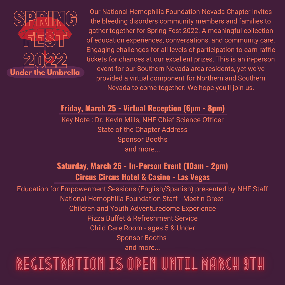 Our National Hemophilia Foundation-Nevada Chapter invites the bleeding disorders community members and families to gather together for Spring Fest 2022. A meaningful collection of education experiences, conversations, and community care. Engaging challenges for all levels of participation to earn raffle tickets for chances at our excellent prizes. This is an in-person event for our Southern Nevada area residents, yet we've provided a virtual component for Northern and Southern Nevada to come together. We hope you'll join us.