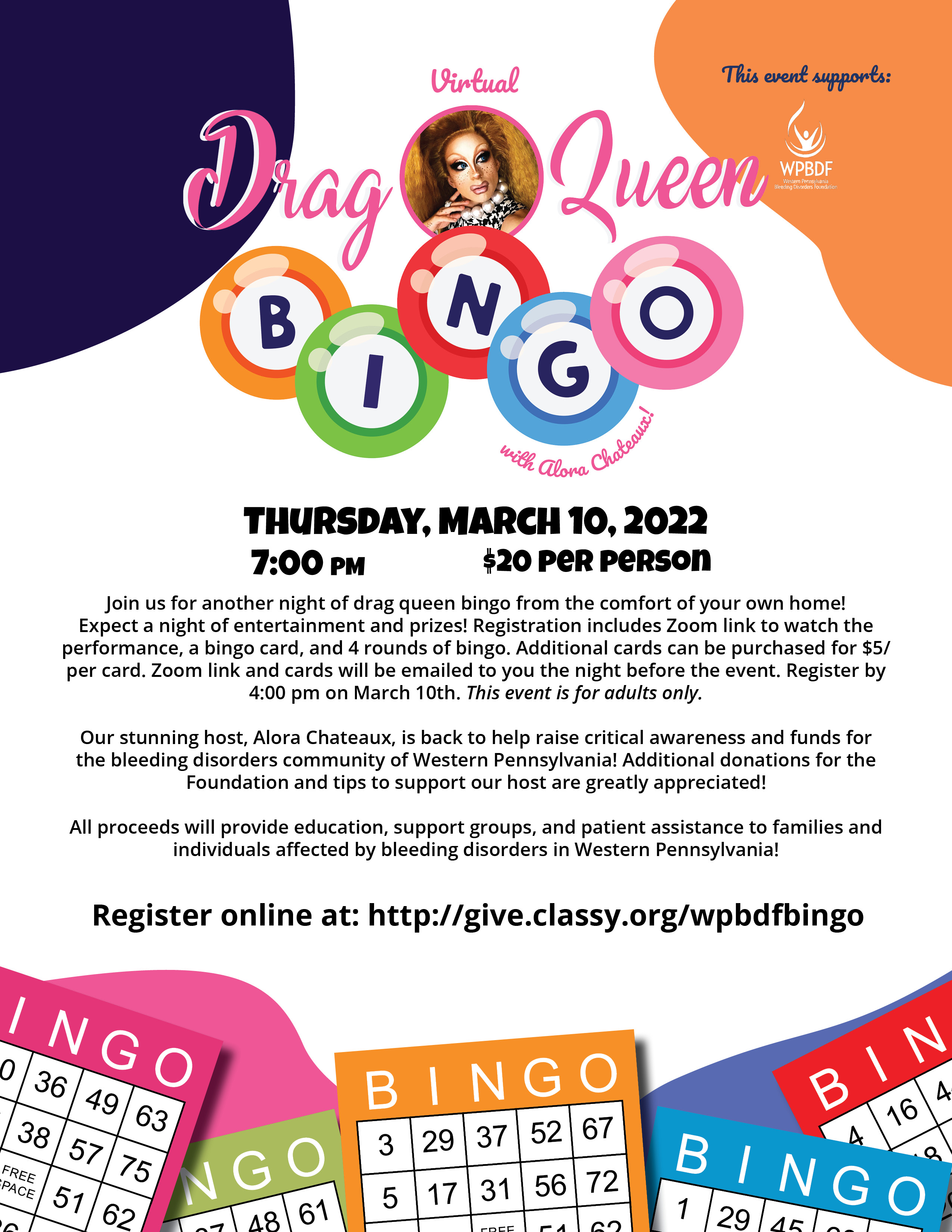 Join us for another night of drag queen bingo from the comfort of your own home! Expect a night of entertainment and prizes! Registration includes Zoom link to watch the performance, a bingo card, and 4 rounds of bingo. Additional cards can be purchased for $5/per card. Zoom link and cards will be emailed to you the night before the event. Register by 4:00 pm on March 10th. This event is for adults only. Our stunning host, Alora Chateaux, is back to help raise critical awareness and funds for the bleeding disorders community of Western Pennsylvania! Additional donations for the Foundation and tips to support our host are greatly appreciated! All proceeds will provide education, support groups, and patient assistance to families and individuals affected by bleeding disorders in Western Pennsylvania! Register online at: http://give.classy.org/wpbdfbingo.